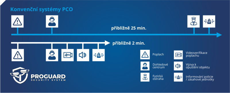 Míg a hagyományos távfelügyeleti riasztórendszerek esetében a rendőrség értesítéséig a reakció idő akár 25 percet is igénybe vehet, a PROGUARD távfelügyeleti központ valós idejű, megbízható videóra reagál, biztosítva a gyors beavatkozást a rendőrség vagy a kivonuló egység számára és a távolról tájékoztatva őket a tettes aktuális pozíciójáról.