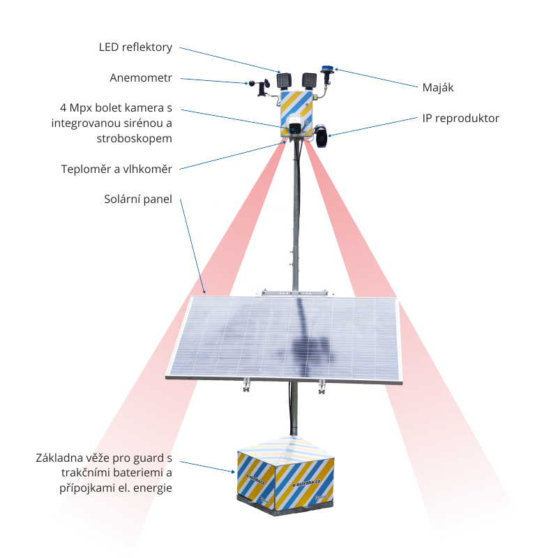A PROGUARD Solar alapfelszereltségként tartalmaz 1x ultraérzékeny 5Mpx kamerát, IP hangszórót, 2x figyelmeztető LED reflektort, 1x kék jelzőfény lámpát. A PROGUARD Solar további négy kiegészítő kamera vagy más Solar tornyok moduláris csatlakoztatását is lehetővé teszi egyetlen rendszerbe.
